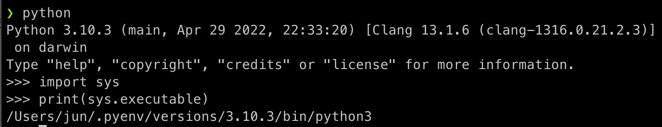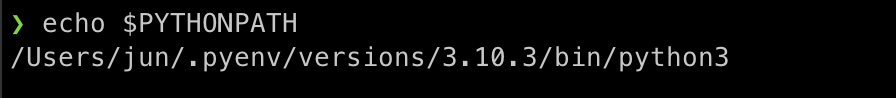 나의 경우에는, /Users/jun/.pyenv/versions/3.10.3/bin/python3 가 python이 설치된 경로였다.