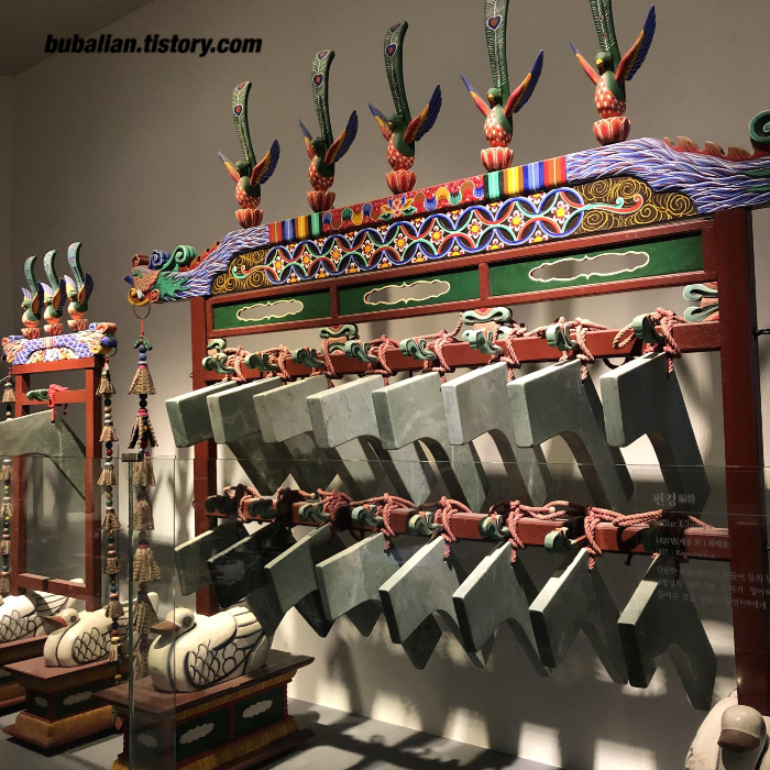 ㄱ자 모양의 돌이 주렁주렁 달린 악기는 편경이다. 세로획과 가로획의 비율에 따라 음의 높낮이가 달라진다. 음을 한번 조율하는 것은 쉽지 않지만, 단단한 돌로 만들어져 다른 악기와는 달리 음이 습도나 온도에 의해 쉽게 변하지 않는다. 이러한 특성으로 국악에서 음을 잡는 표준 역할을 수행한다고 한다.