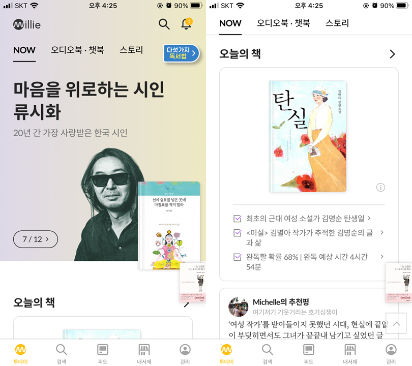 앱을 켜면 배너를 통해 여러 이벤트, 캠페인 등을 확인할 수 있고 이와 관련된 책을 추천받을 수 있습니다. 또 <오늘의 책> 코너를 통해 하루에 한 권씩 밀리의 서재 측이 선정한 책을 만나볼 수도 있죠. 책을 읽다보면 처음에는 읽고 싶은 책 목록이 잔뜩 있다가도, 나중에 가면 '뭐 읽지?' 같은 생각이 들 때가 있습니다. 그럴 때 이런 추천이 도움이 됩니다. 적어도 불쏘시개를 추천하지는 않겠지요(물론 사람마다 취향은 제각각이라 불쏘시개가 걸릴 때도 있긴 합니다).