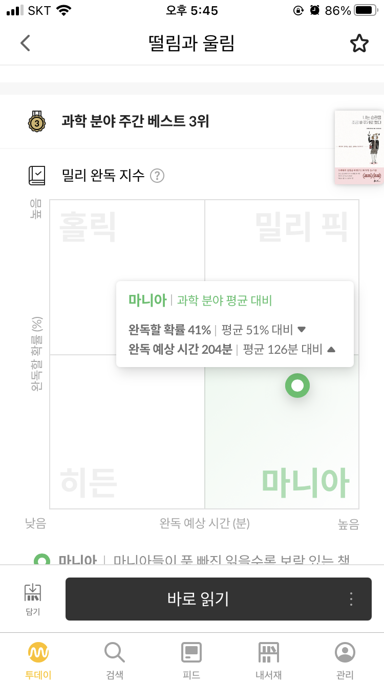 책마다 달려 있는 '밀리 완독 지수'도 별로 마음에 들지 않습니다. 특정 분야의 도서 평균 대비 완독할 확률과 완독에 걸릴 예상 시간을 보여주는데, 남들이 얼마나 완독 했는지가 무슨 의미가 있는지 잘 와 닿지 않습니다. 독서가 퍼즐 맞추기도 아니고 '이 책은 완독 확률이 높으니 도전해봄직 하겠어' 혹은 '이 책은 완독 확률이 낮네. 섣불리 덤볐다간 큰코다치겠는걸. 일단 접어두고 다른 책을 찾아보자'라고 할 사람이 얼마나 될까요. 그리고 이런 독서 습관이 과연 바람직한 것일까요. 더구나 대여 서비스 특성상 애초에 전혀 읽을 마음이 없는데 일단 클릭만 해보고 읽지 않는 경우도 굉장히 많을 겁니다. 이런 쓰레기 데이터를 배제하는 데이터 전처리가 제대로 이루어진 후 제공되는 통계 인지도 의문입니다. 물론 유용하게 느끼는 분들도 있겠지만, 적어도 저는 한줄리뷰와 완독 지수 모두 자칫 독서 경험을 방해할 수도 있는 요소라고 생각합니다.